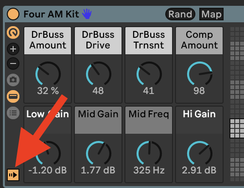 With activated „Auto Select“ in a Ableton Live drum rack incoming MIDI notes (Launchpad Pro) auto select the playing chain/device in the drum slot.