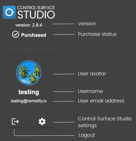 Displays the app version number which you are currently using. You download the latest version of Control Surface Studio from the Downloads section your account.