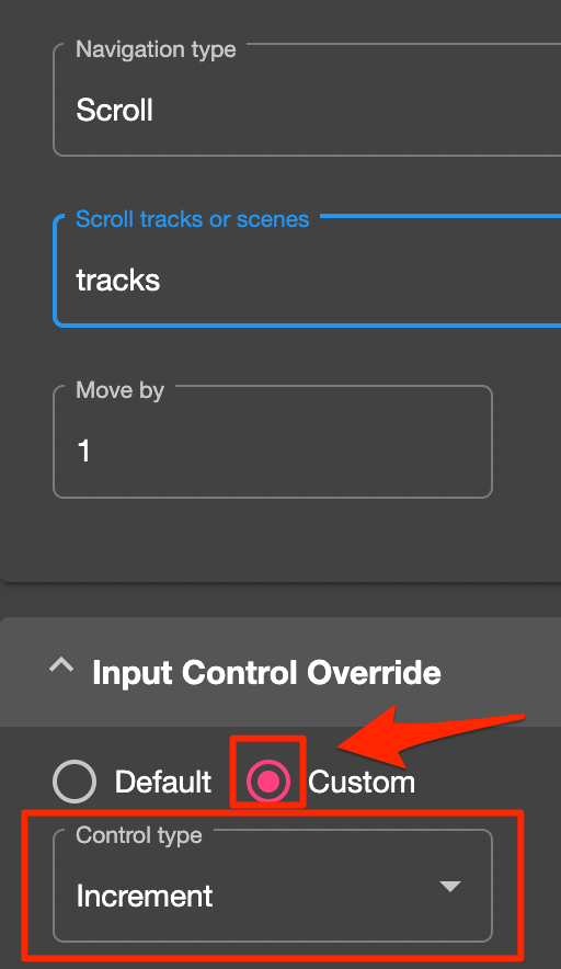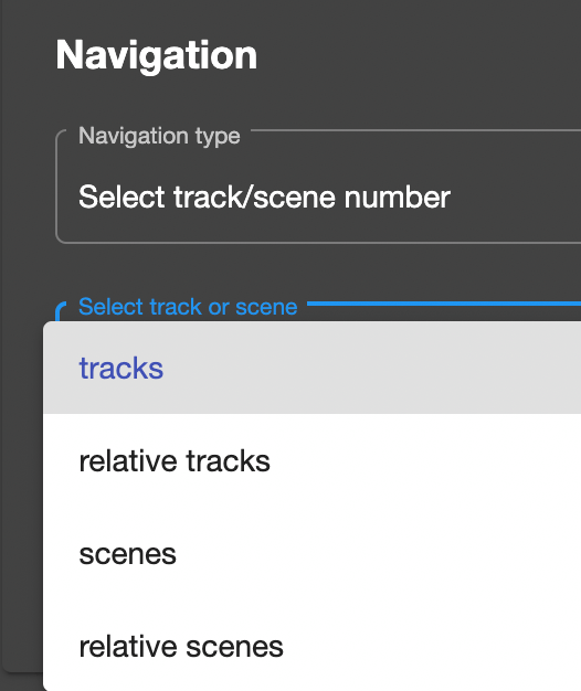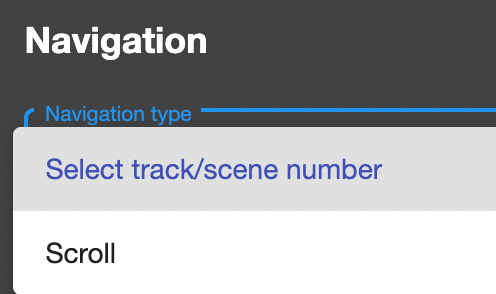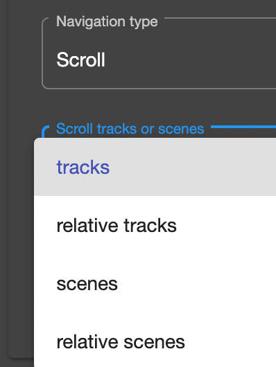 The Navigation Type allows you to choose between Select track/scene number and Scroll. The options below this menu will change depending on your selection.