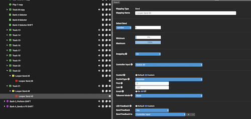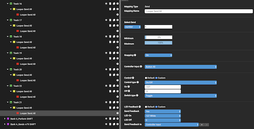 I have 21 tracks in my template, and on each one I’ve assigned the same button to set Send 6 to Max/Min (see image for an example). There is no toggle option to set for all of these. Is there a better way to achieve a single button for all send on/off that enables toggle instead of momentary?