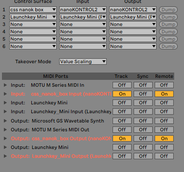 This is happening to both the nanoKontrol2 (which I’ve created a very simple session box script for) and also the Novation Luanchkey mini that has its own manufacturer’s script.