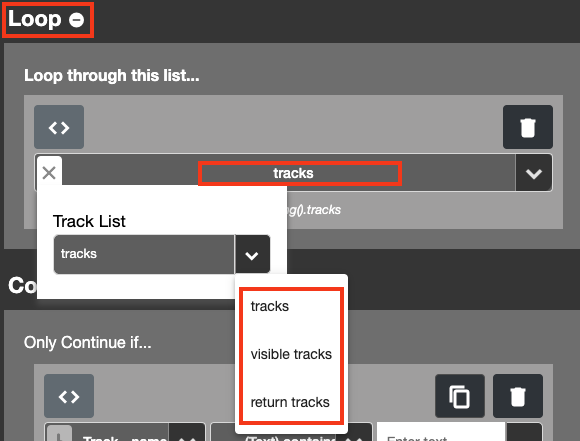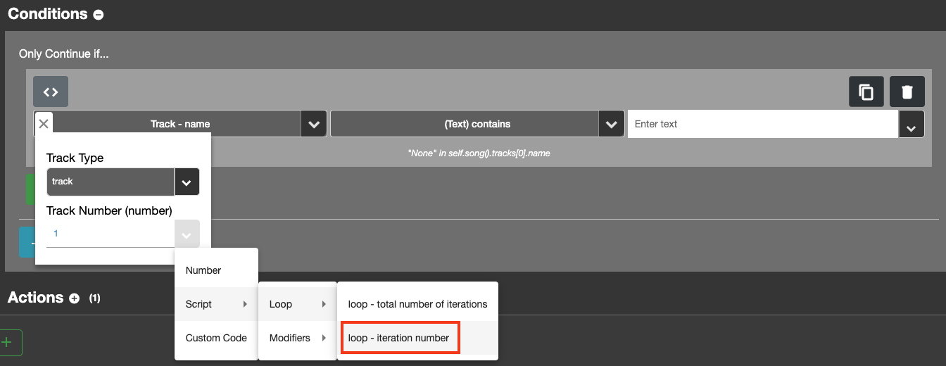Then, once the Condition has found the right Track, you’ll need to use that loop_number again in the Action, that will be the number of the track you’re looking for.