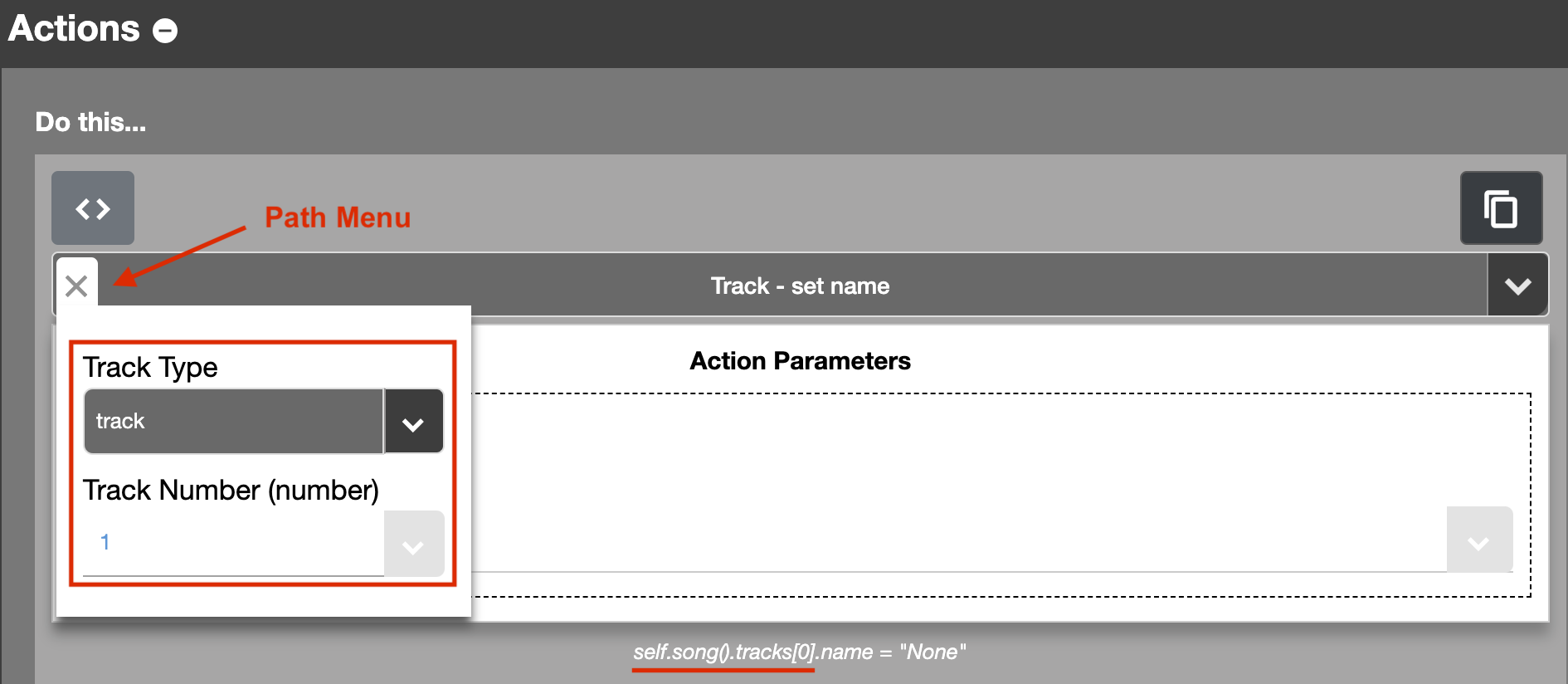 As you can see in the “Path Menu”, Track 1 is selected by default (there’s a lot of other options in the Path Menu as well). The code that points to Track 1 is at the bottom of the Action (underlined by me):