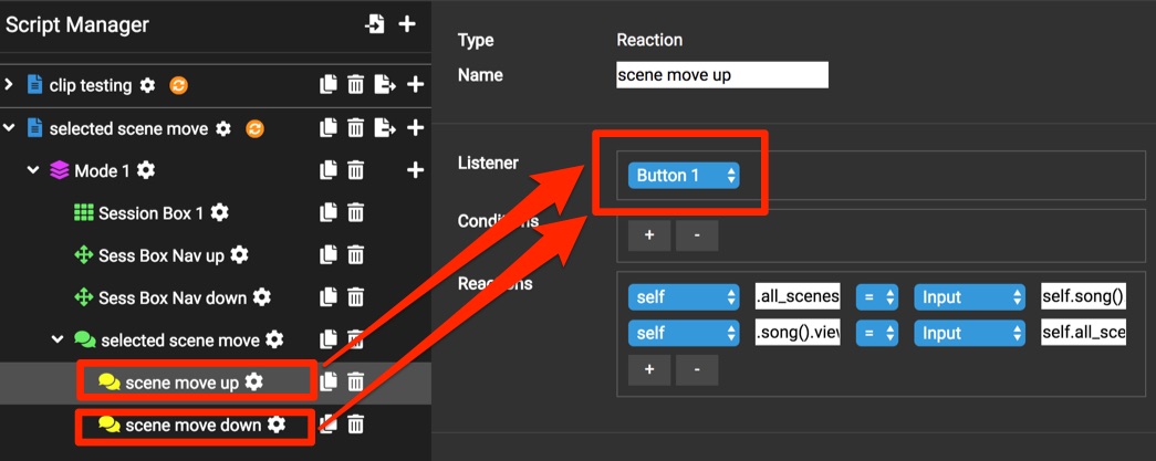 Note: make sure you attach the ‘scene move up’ reaction to your session box scene up button etc